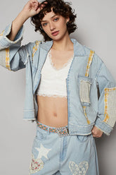 POL Zip Up Floral and Lace Patch Washed Denim Jacket - Light